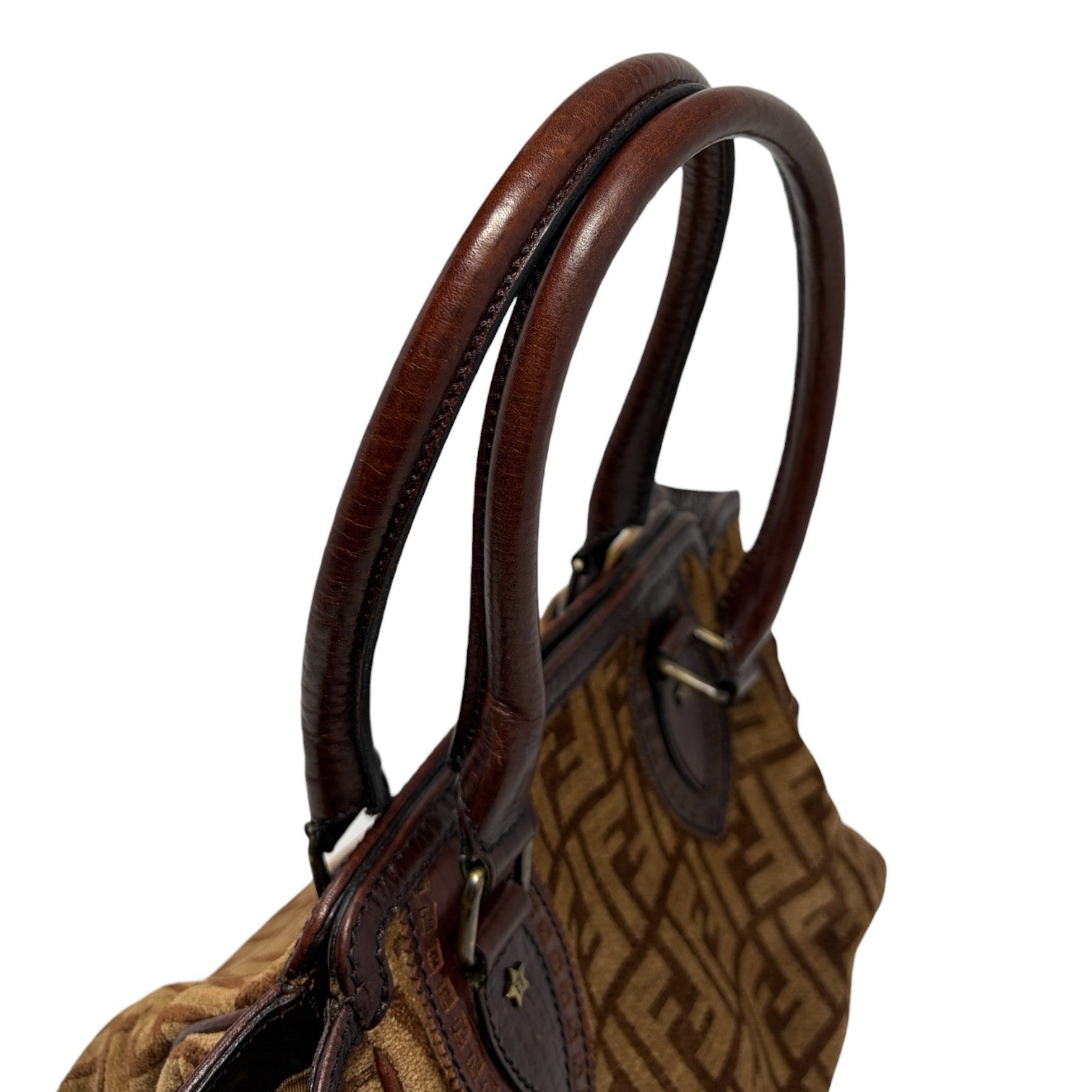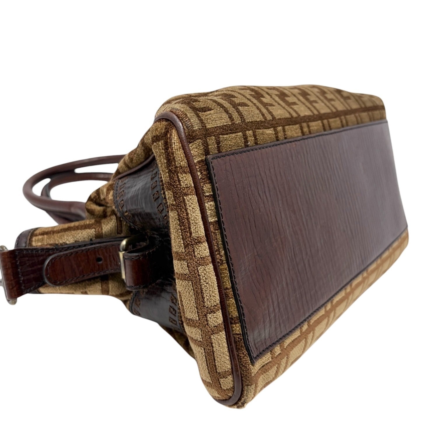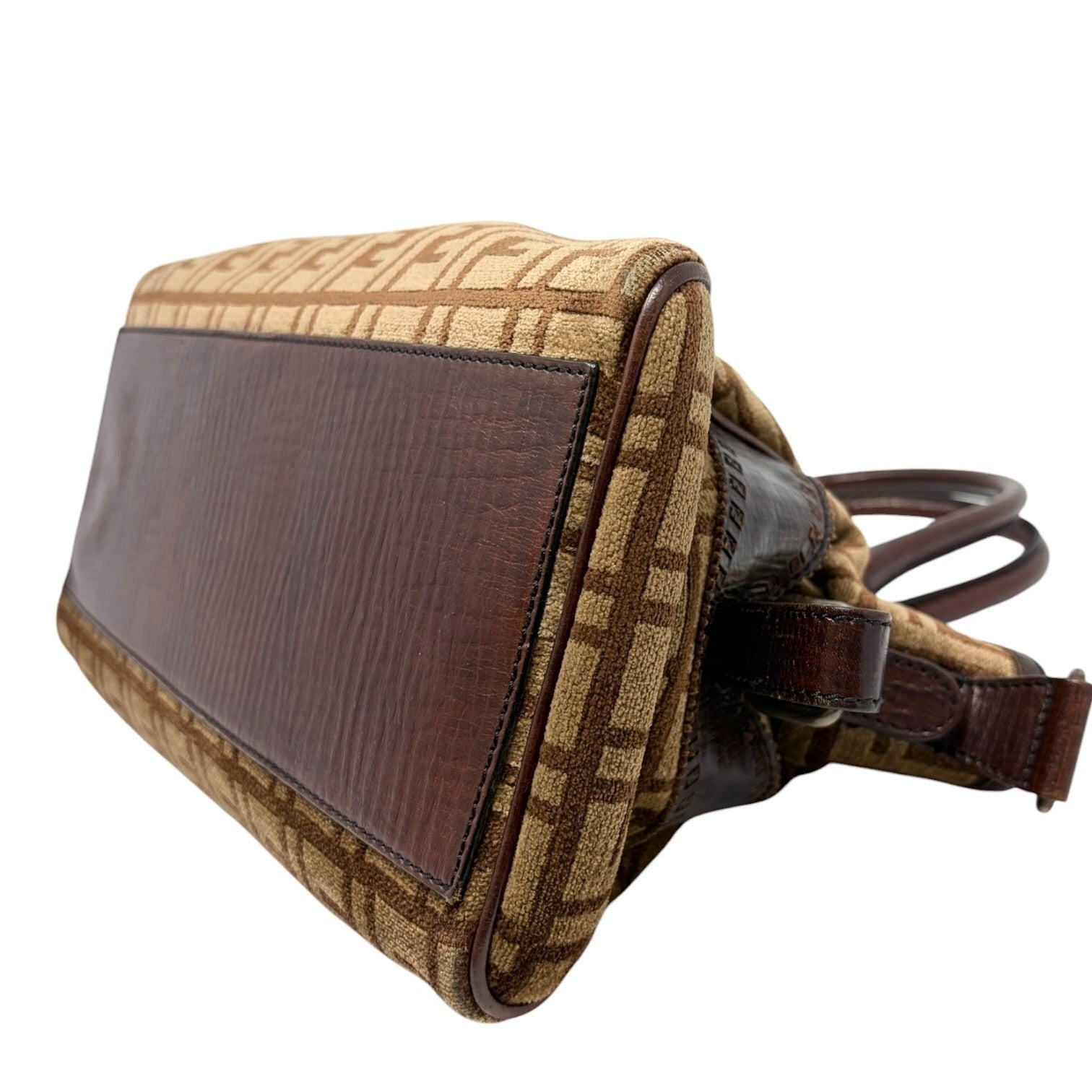 FENDI Vintage FF Logo Zucca Etniko Shoulder Bag Brown Gold Velour Leather