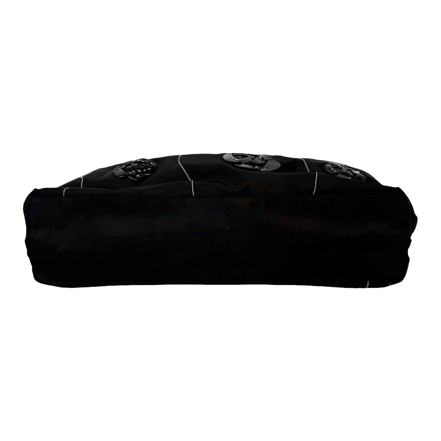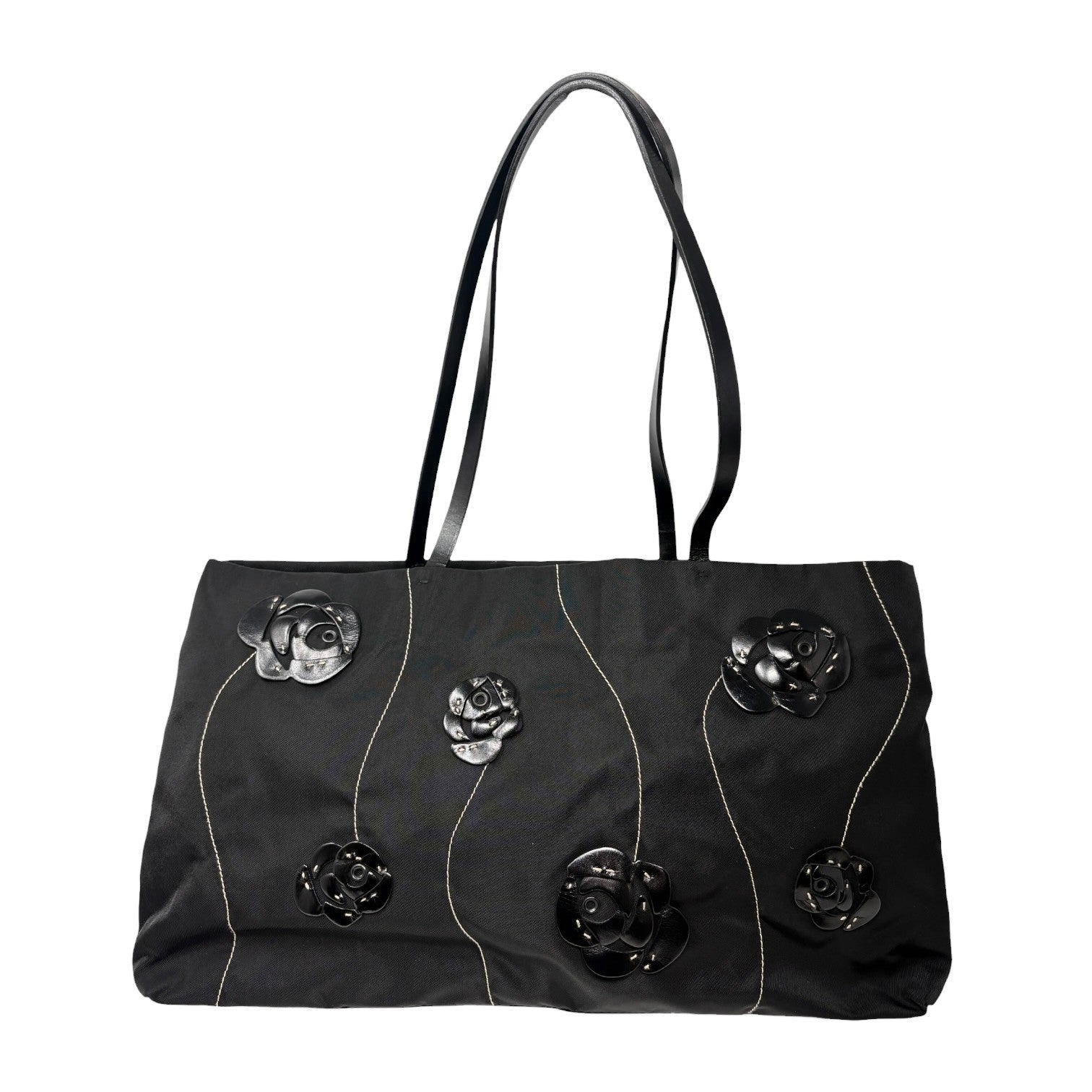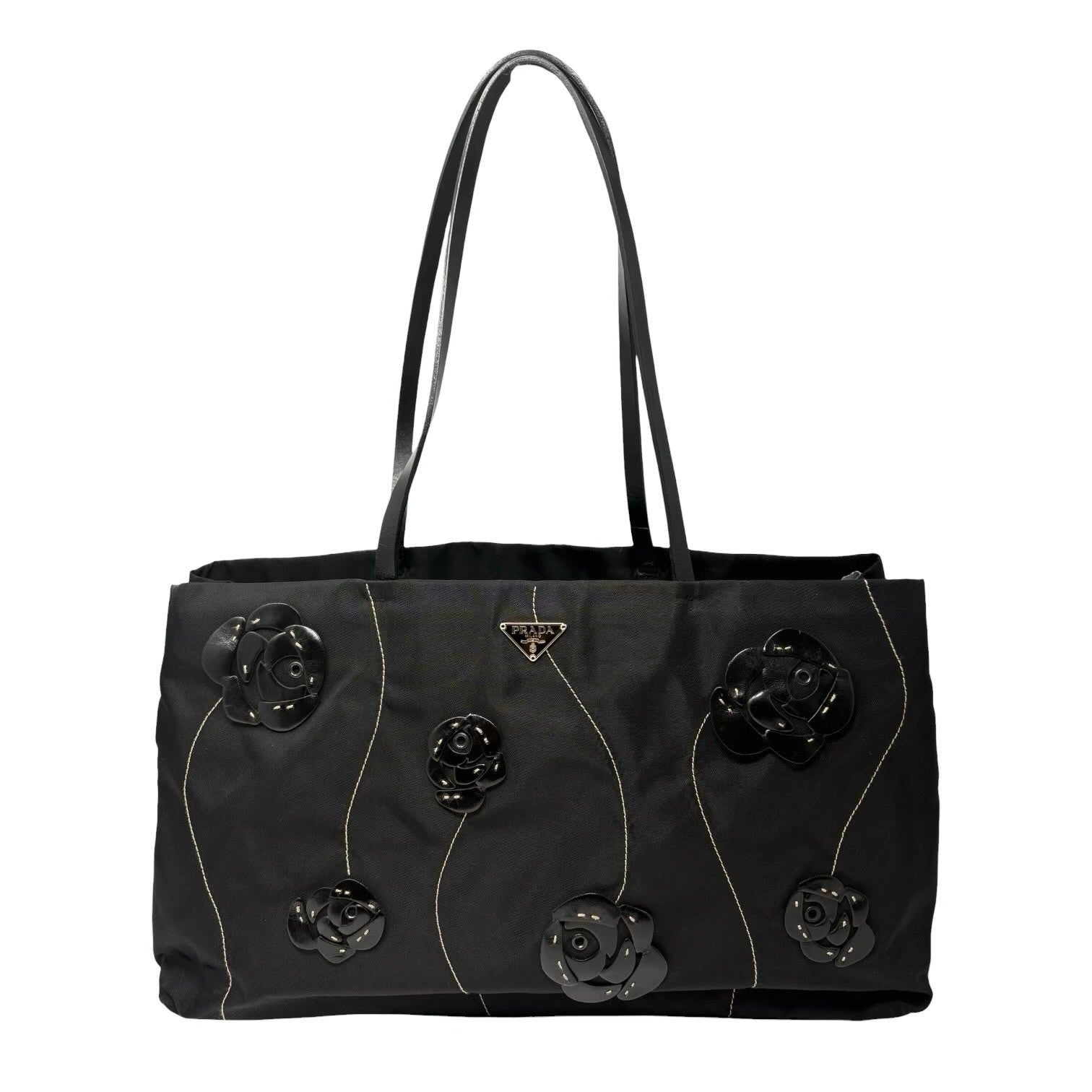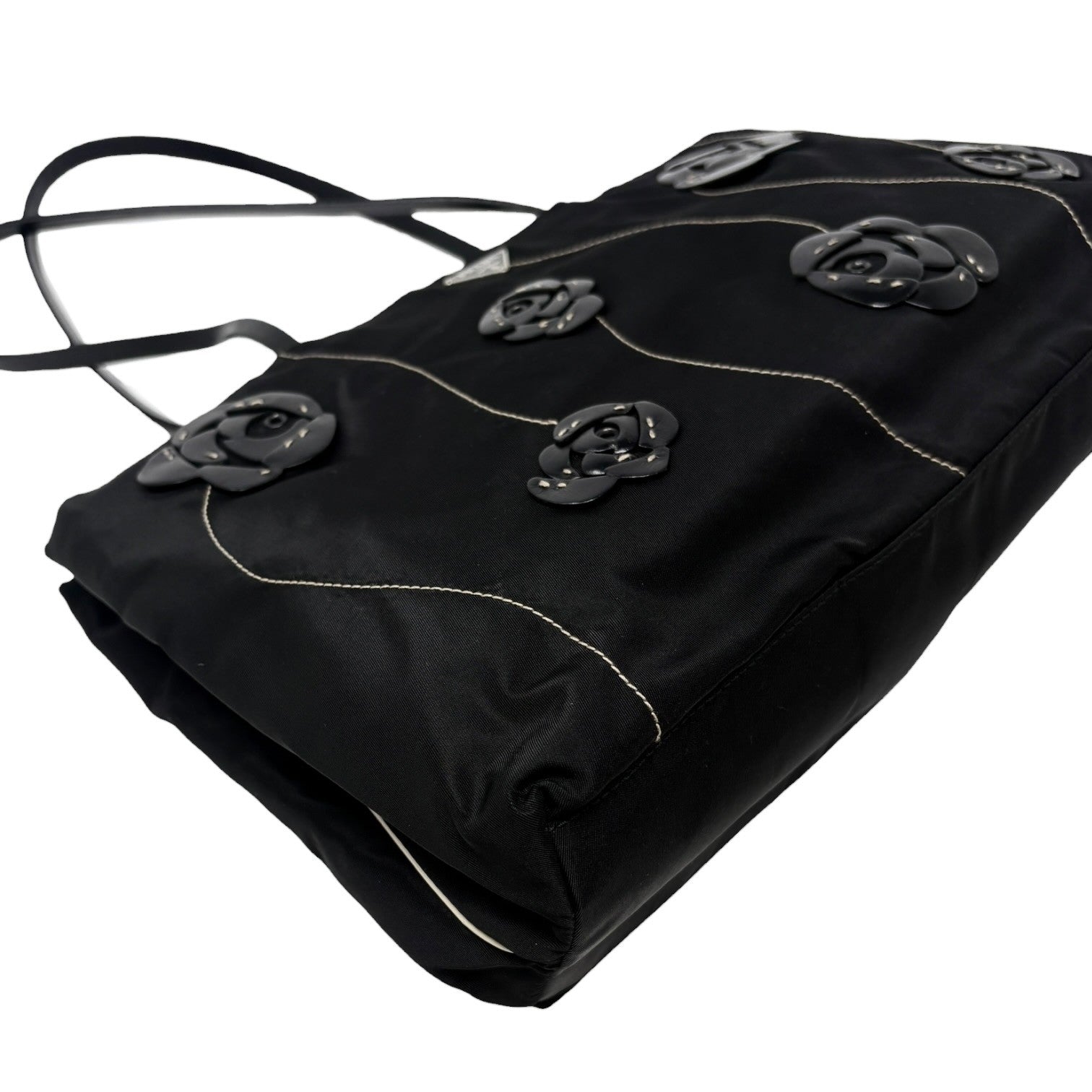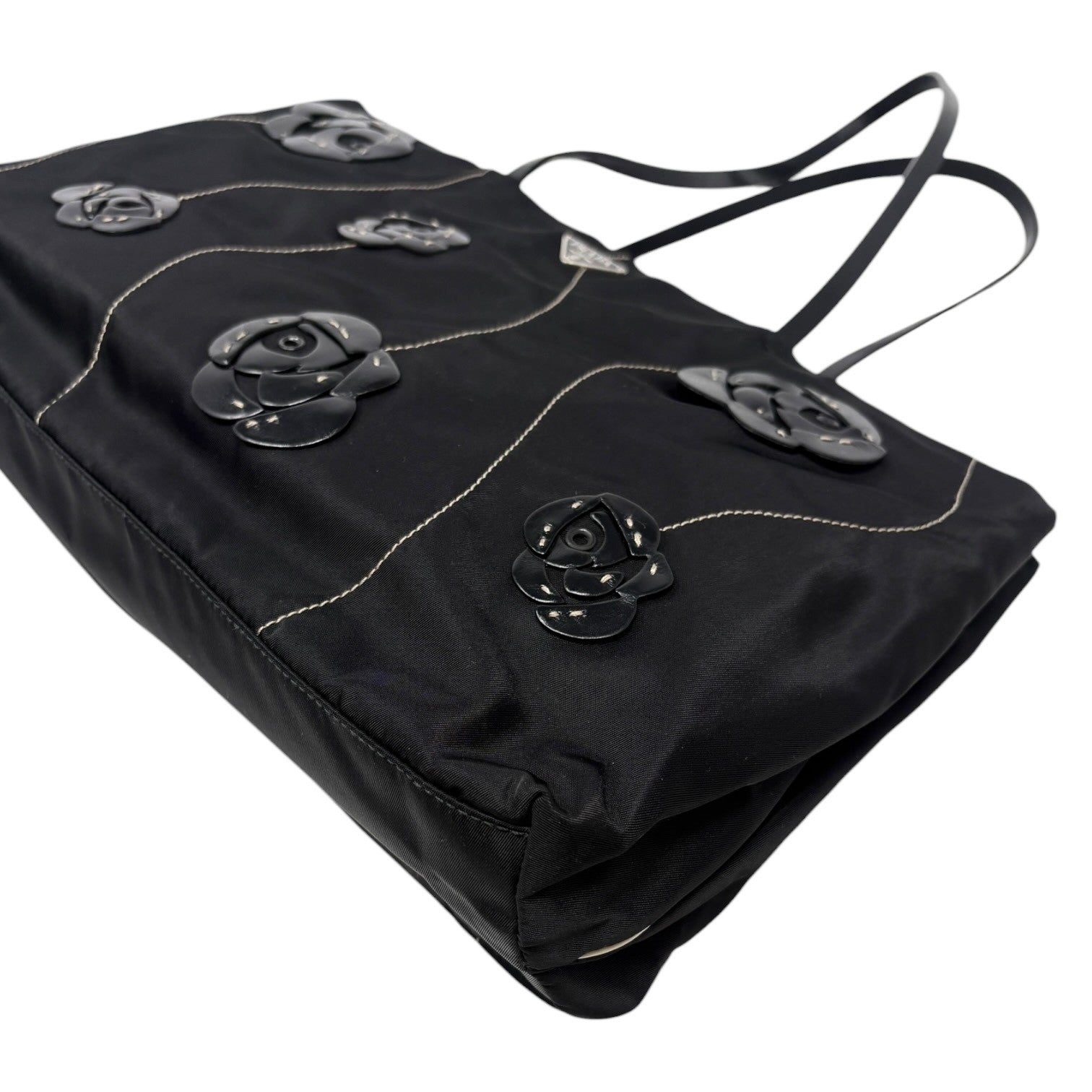 PRADA Vintage Logo Tessuto Nylon Fiori Shoulder Bag Black Gold Rose Leather