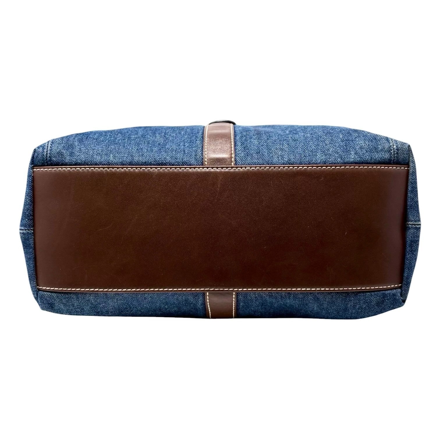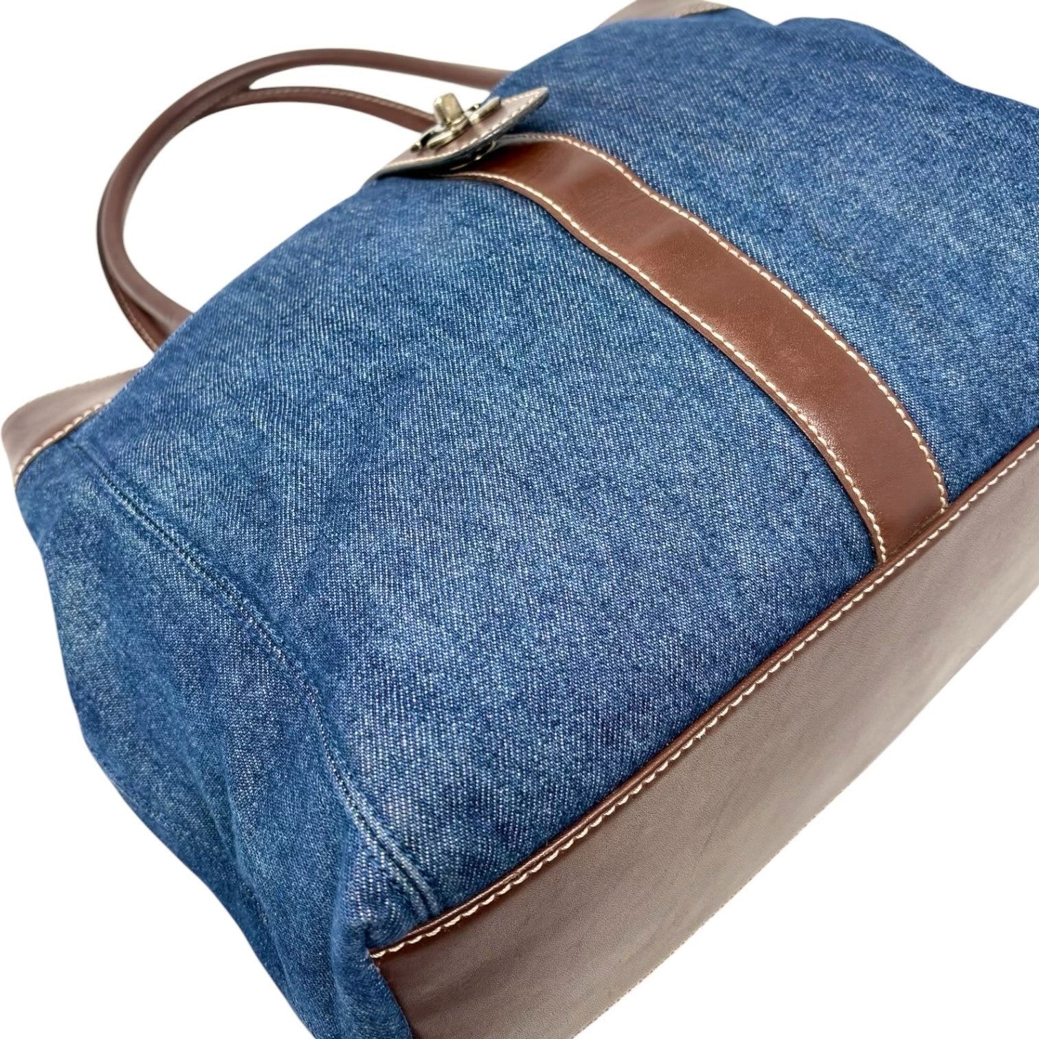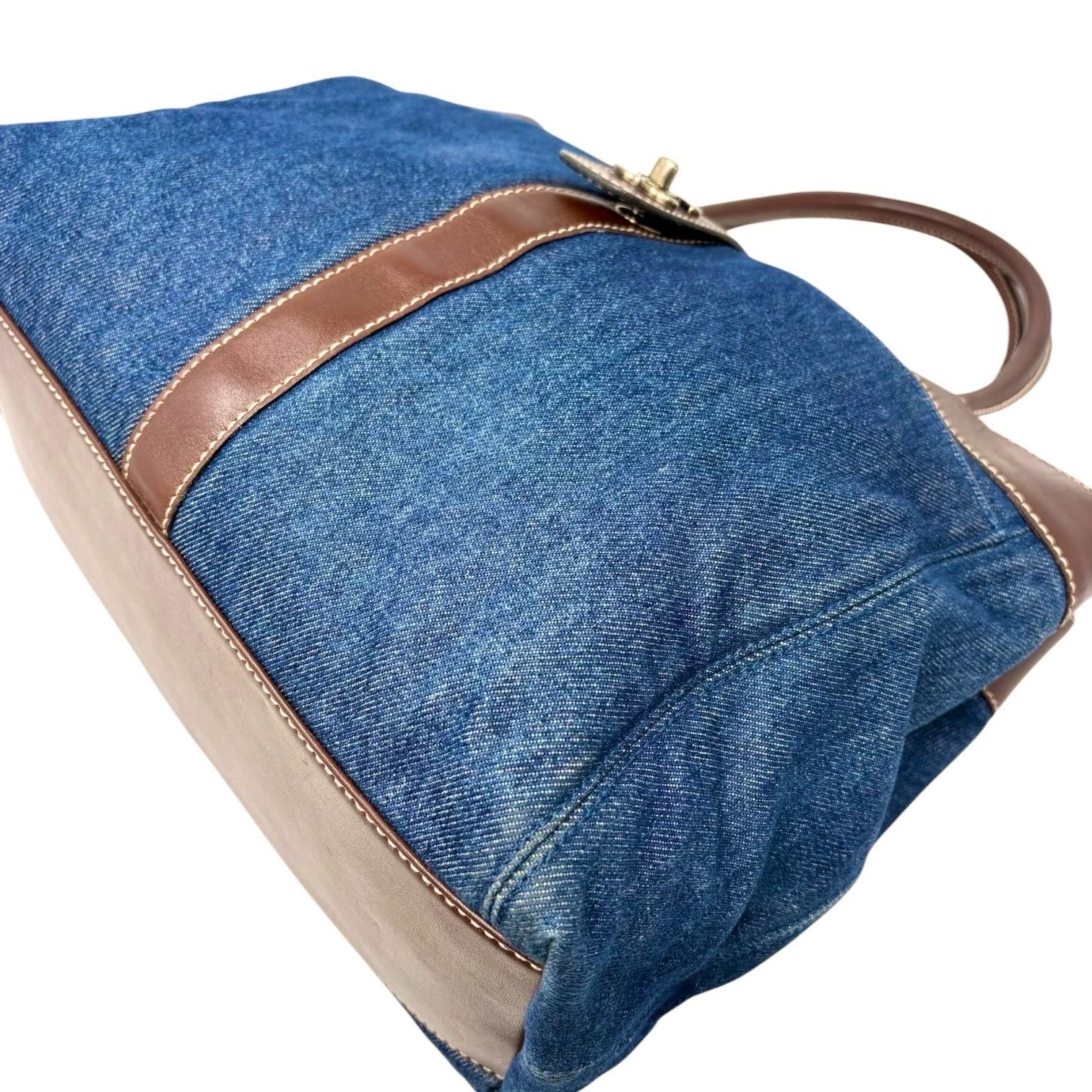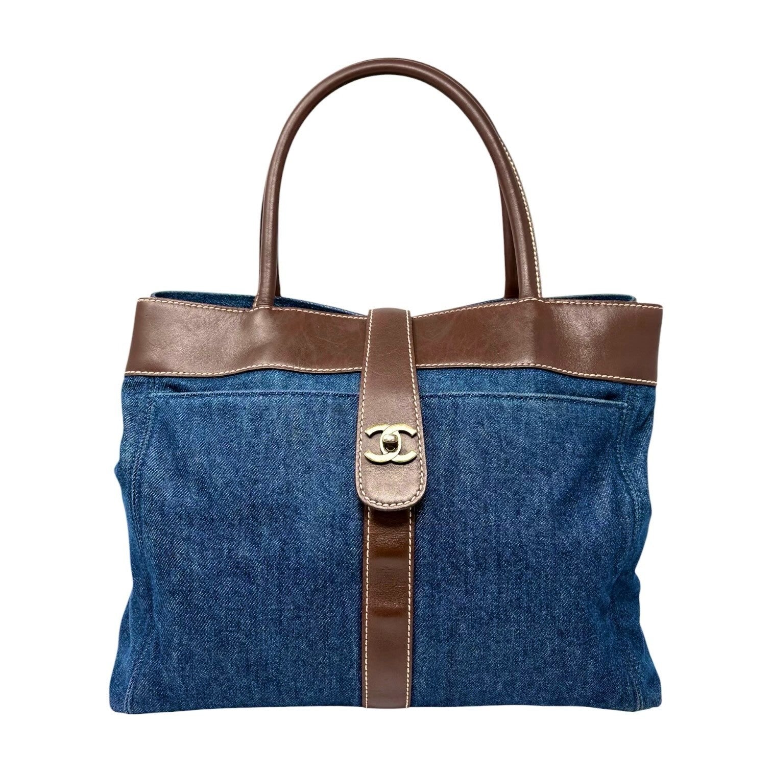 CHANEL Vintage CC Logo Denim Turnlock Tote Shoulder Bag Blue Brown Leather